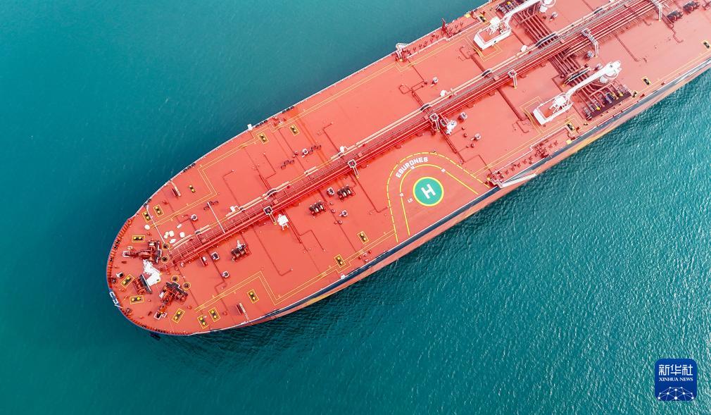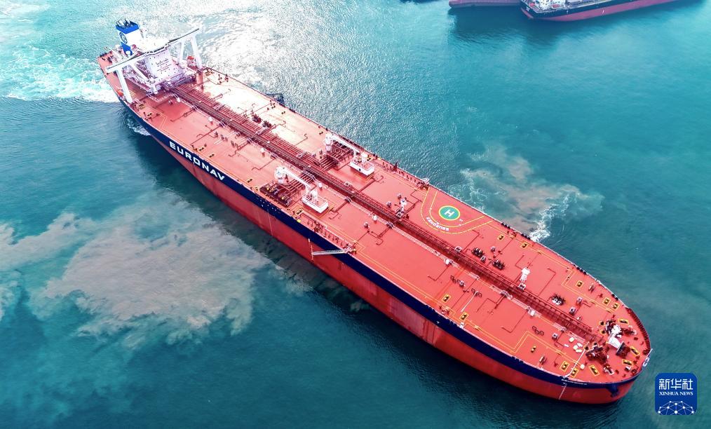 1月14日,31.9萬噸氨預(yù)留超大型原油船“EBURONES”輪在青島正式啟航(無人機照片)。