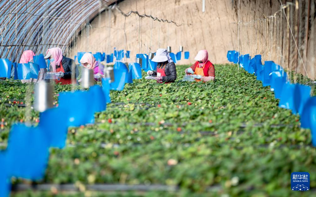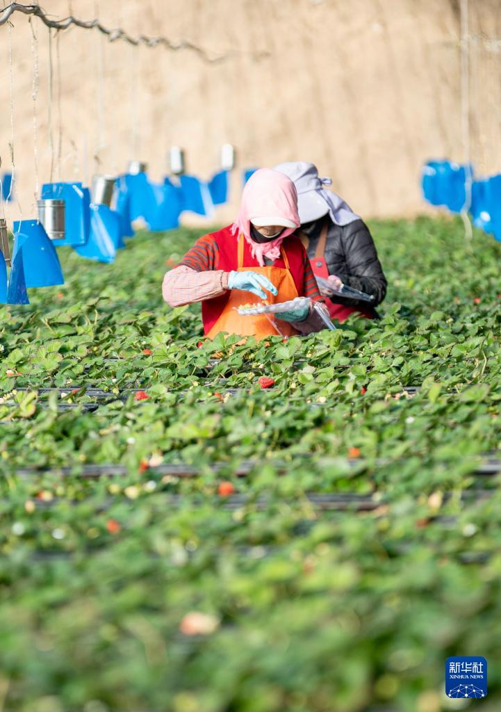 1月15日,農(nóng)民在位于寧夏銀川市賀蘭縣習(xí)崗鎮(zhèn)的新平村設(shè)施園區(qū)草莓溫棚內(nèi)采摘草莓。