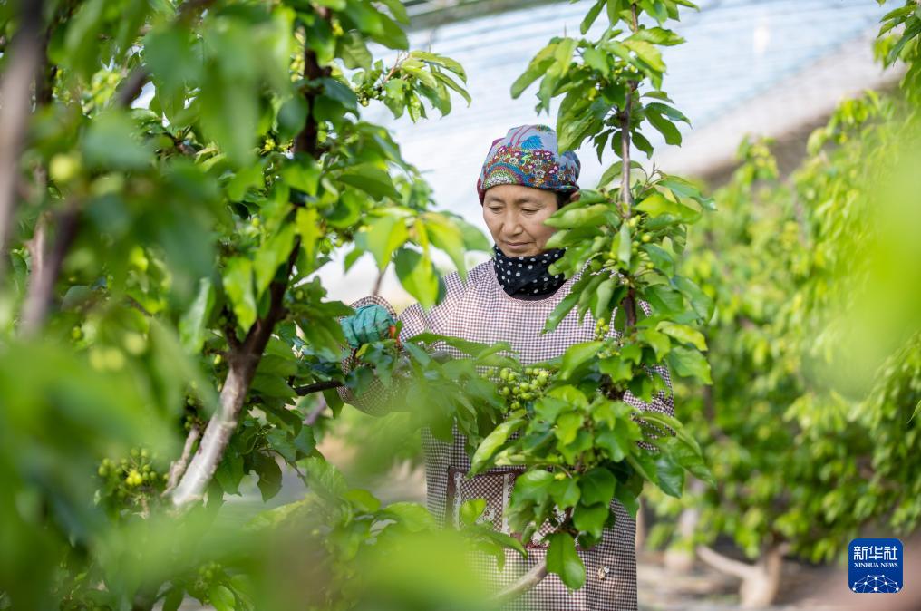 1月15日,農(nóng)民在位于寧夏銀川市賀蘭縣習(xí)崗鎮(zhèn)的新平村設(shè)施園區(qū)櫻桃溫棚內(nèi)勞作。