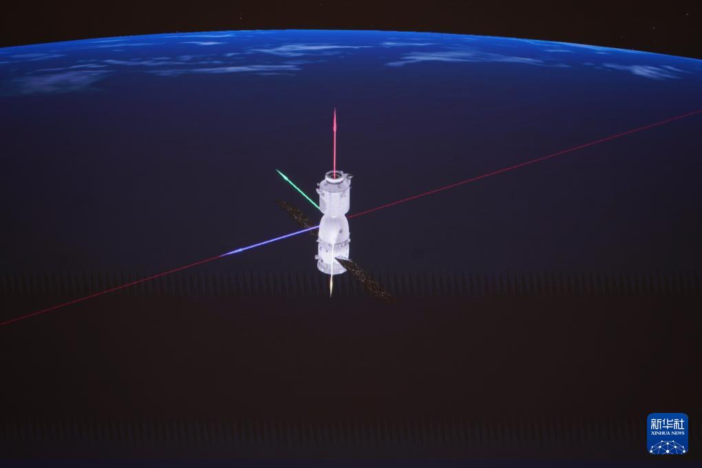 1月19日在北京航天飛行控制中心拍攝的神舟二十號(hào)飛船正常軌道飛行姿態(tài)的模擬畫面。