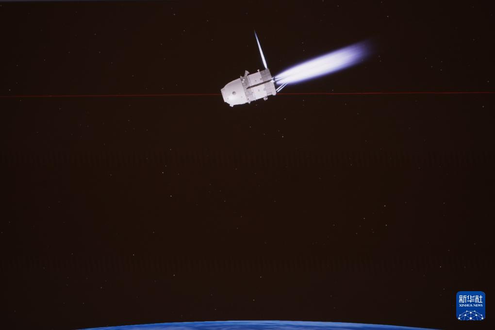 1月19日在北京航天飛行控制中心拍攝的神舟二十號(hào)飛船發(fā)動(dòng)機(jī)制動(dòng)的模擬畫面。