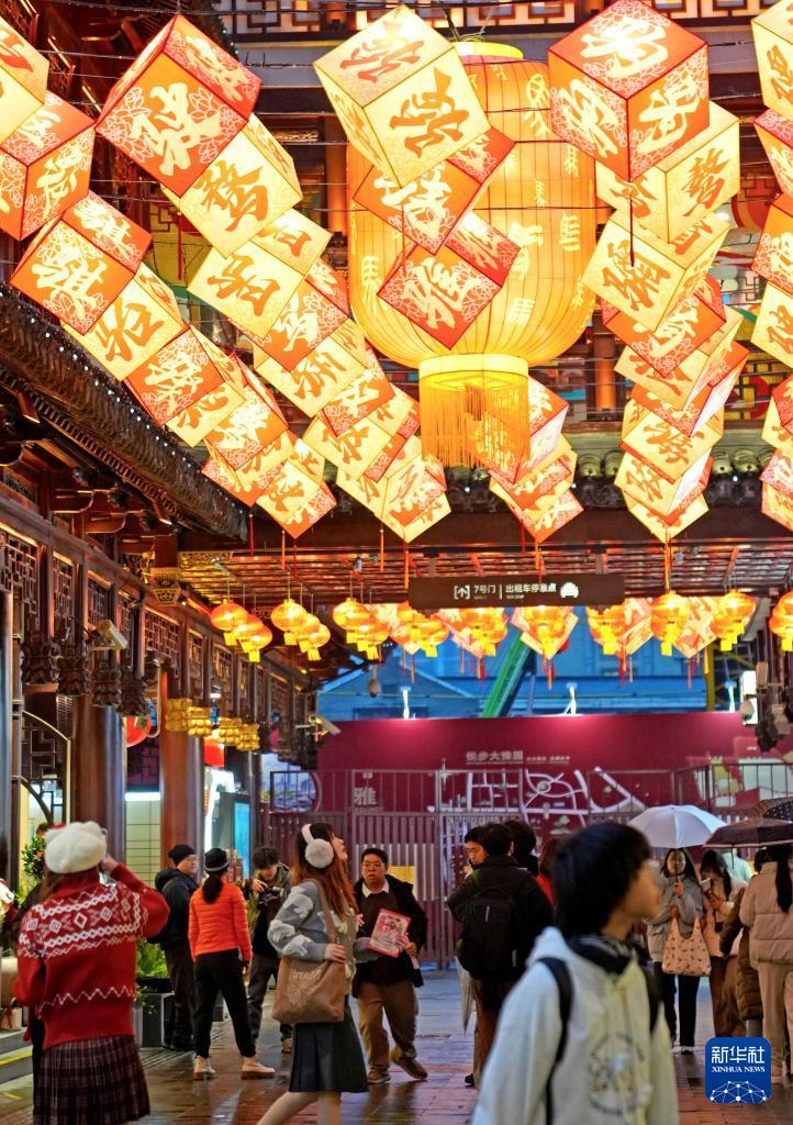 1月26日,豫園燈會(huì)上的春聯(lián)與流光溢彩的花燈營(yíng)造出新春的喜慶氛圍。