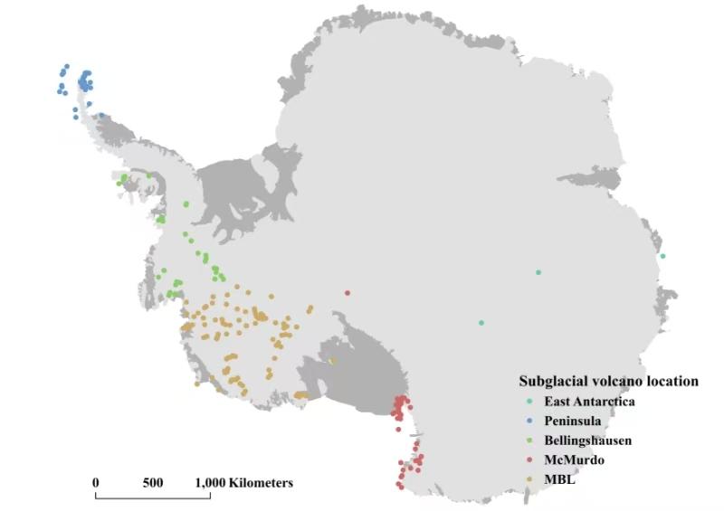 南極冰下火山分布圖。(中國(guó)極地研究中心供圖)