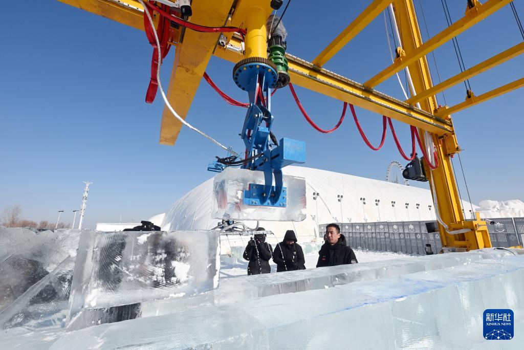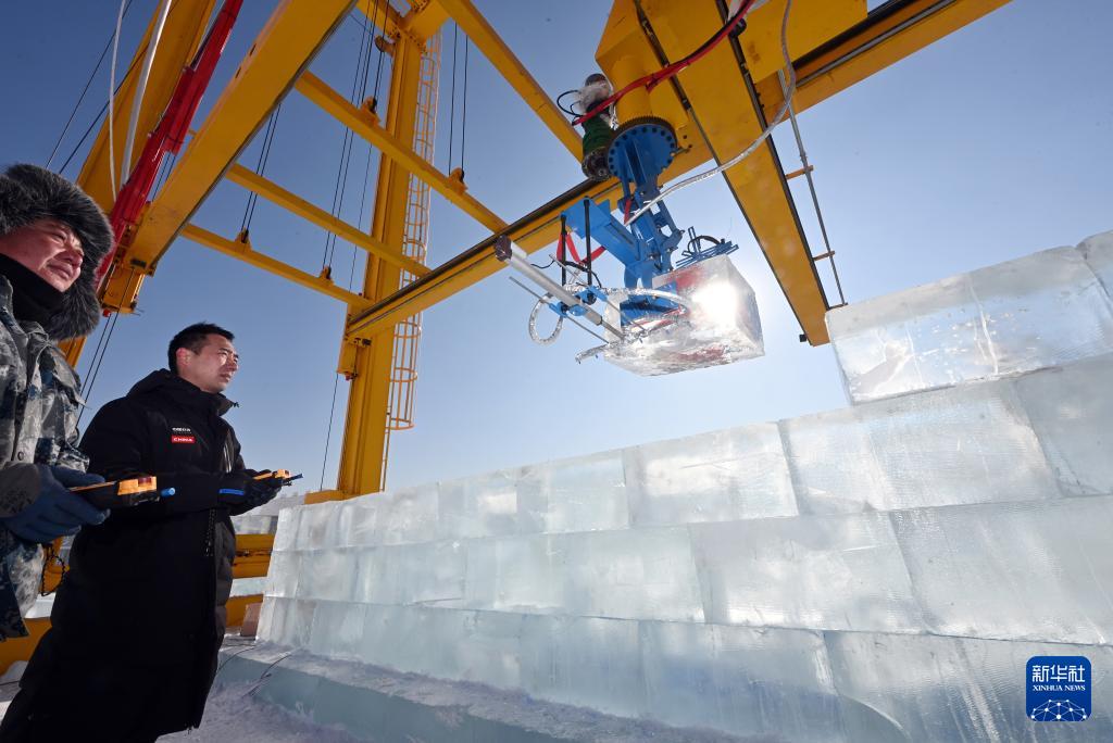 2月3日,在第二十七屆哈爾濱冰雪大世界園區(qū),智能大型冰雕自動化搭建機(jī)器人進(jìn)行冰塊的提升、搬運與砌筑。