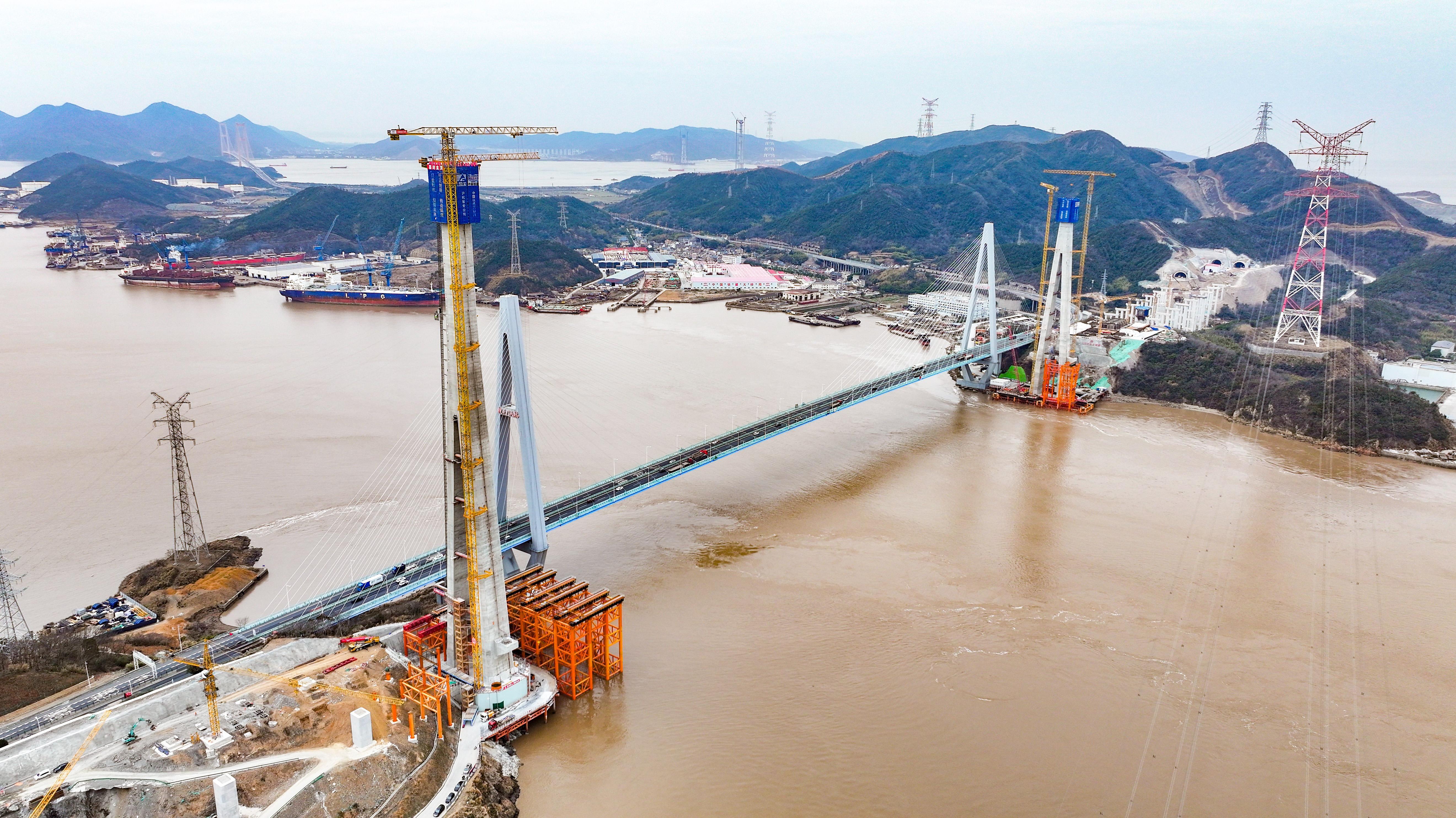 桃夭門公鐵兩用大橋連接舟山富翅島與冊子島。大橋主橋長1066米、主跨666米,其跨度在同類型橋梁中位居世界第一。本次封頂?shù)母怀釐u側(cè)主塔高198.1米,主塔采用空心鋼筋混凝土結(jié)構(gòu),整體呈倒“Y”造型。