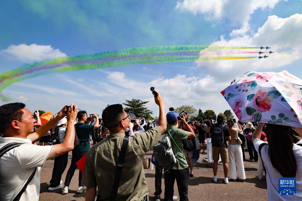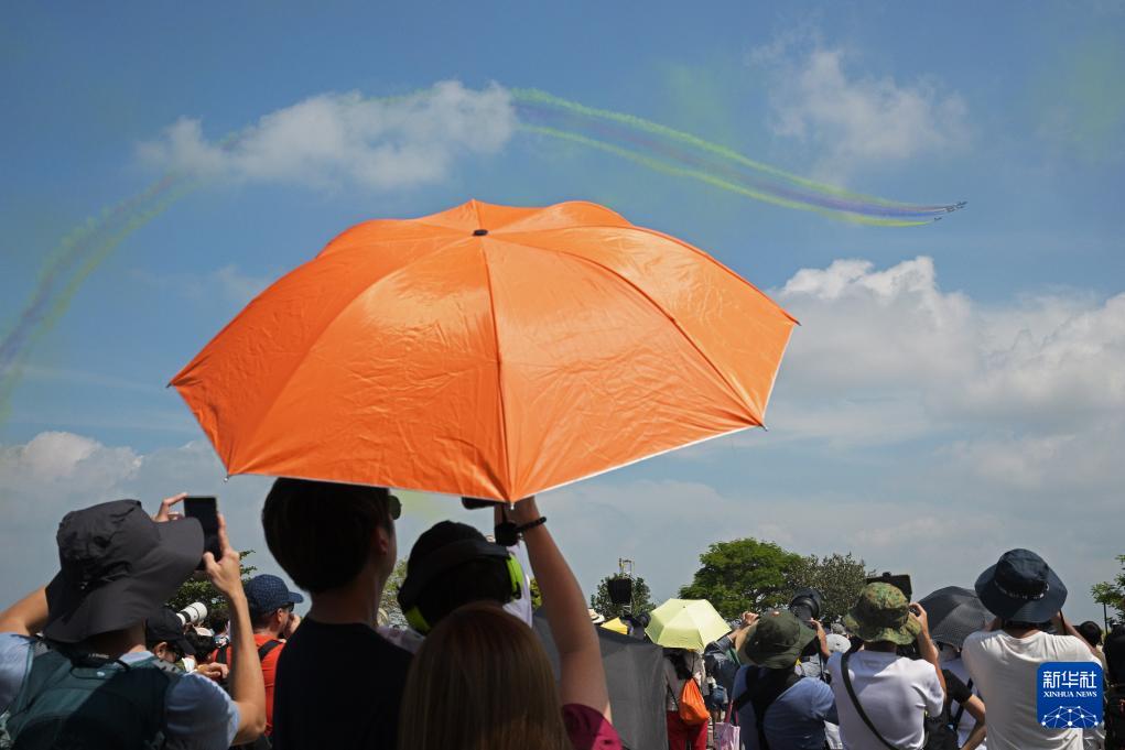 2月7日,在新加坡樟宜展覽中心,觀眾觀看中國(guó)空軍八一飛行表演隊(duì)的飛行表演。新華社發(fā)(鄧智煒攝)