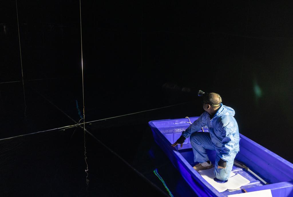 在位于四川省稻城縣海子山的高海拔宇宙線觀測站“拉索”水切倫科夫探測器陣列水池,科研人員坐船更換實驗設(shè)備(2023年4月21日攝)。新華社記者 金立旺 攝