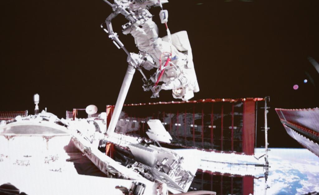 這是2025年5月22日在北京航天飛行控制中心屏幕上拍攝的神舟二十號航天員陳冬在空間站組合體艙外工作的畫面。新華社記者 厲彥辰 攝