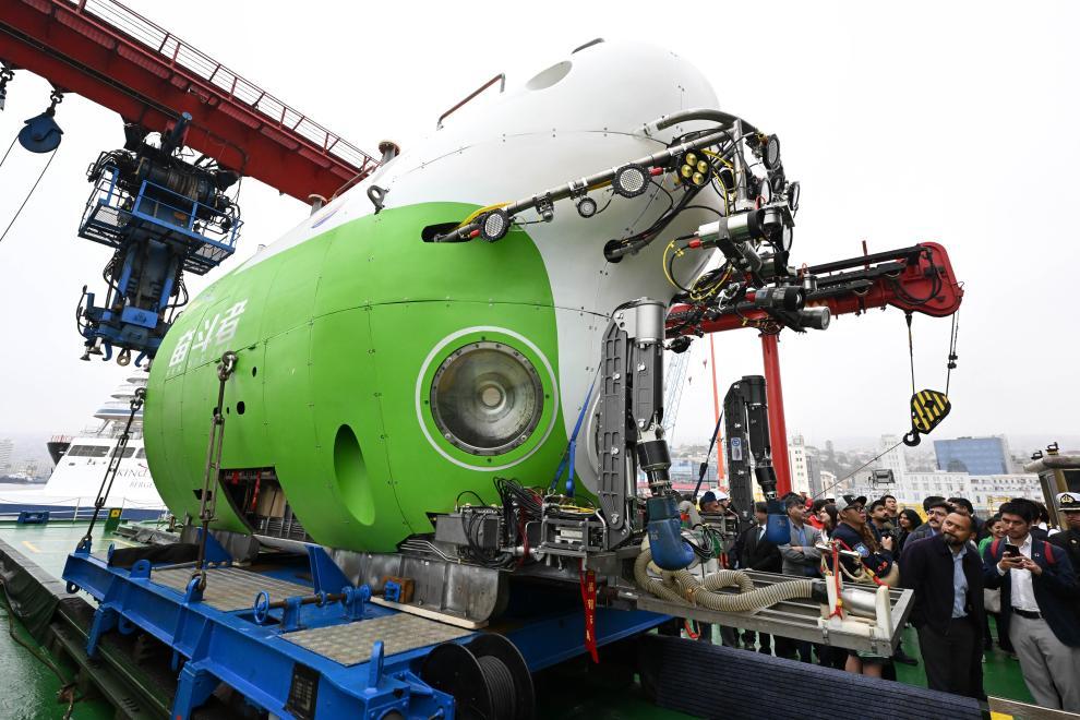 2026年1月19日,在??坑谥抢胁客郀柵寥R索港的中國“探索一號”科考船上,人們參觀“奮斗者”號載人潛水器。新華社發(fā)(豪爾赫·比列加斯 攝)
