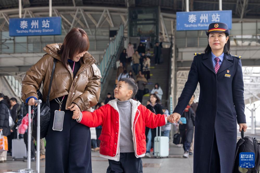 2月19日,江蘇泰州站工作人員幫助旅客進(jìn)站乘車。
