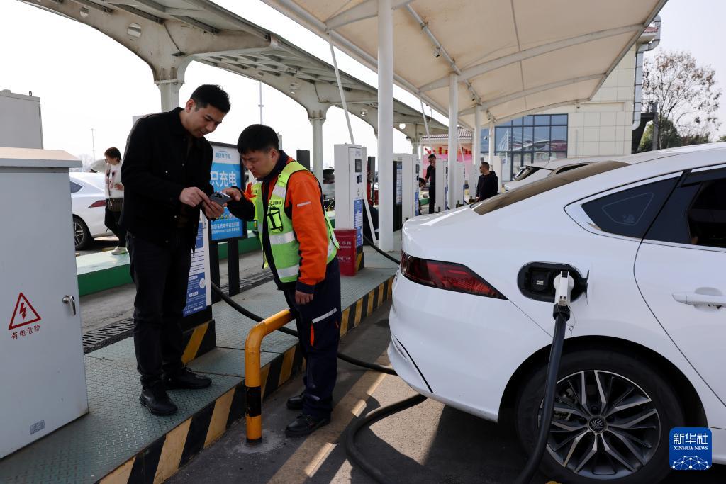 2月19日,在四川省成樂高速公路東坡區(qū)段的眉山服務(wù)區(qū),工作人員為旅客(左)提供新能源汽車充電服務(wù)。