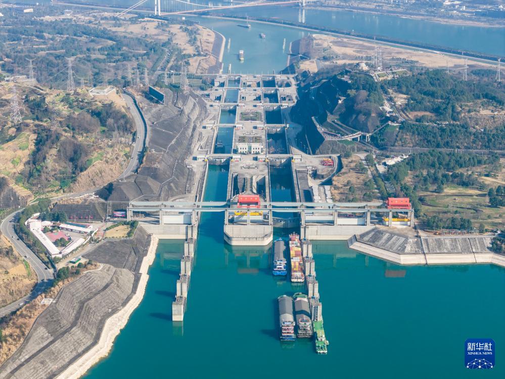 2月19日,在湖北宜昌,船舶有序通過長(zhǎng)江三峽雙線五級(jí)船閘(無人機(jī)照片)。