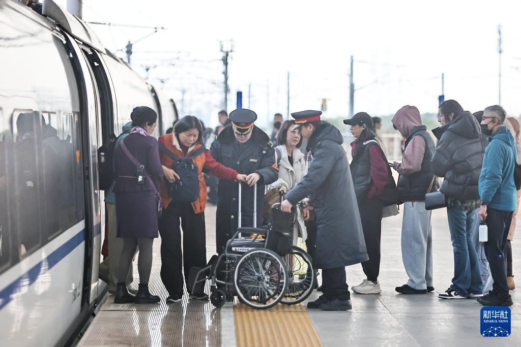 2月19日,在鐵路浙江嘉興南站站臺(tái),工作人員攙扶一名腿部受傷旅客下車坐上輪椅車,為其提供出站服務(wù)。