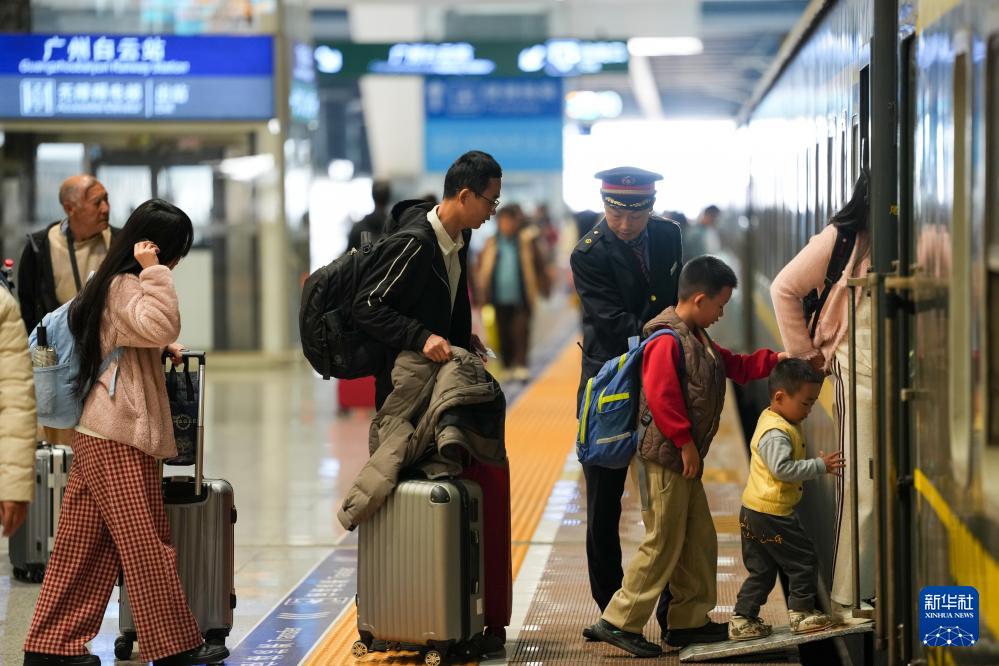 2月19日,列車員在廣州白云站協(xié)助旅客上車。