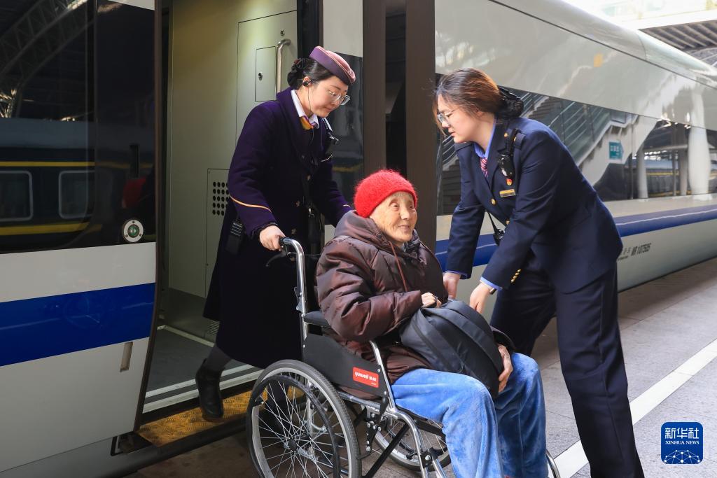 2月19日,工作人員在南京火車站幫助一名老人乘車。