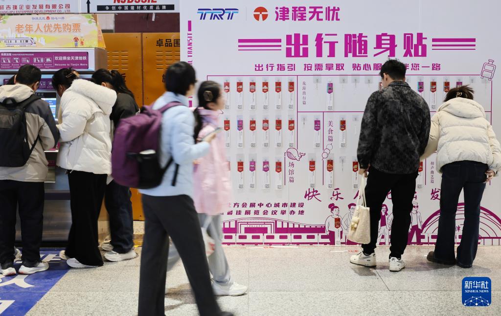2月19日,在天津西站地鐵站出入口處,乘客拿取出行隨身貼。出行隨身貼上標(biāo)有地鐵站附近的景點(diǎn)、美食、娛樂活動(dòng)等信息,方便乘客出行參考。