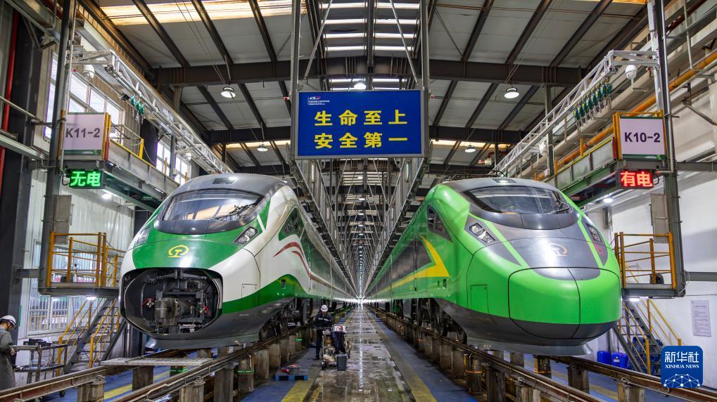 這是2月18日在中國(guó)鐵路昆明局集團(tuán)有限公司昆明車輛段昆西運(yùn)用車間檢修庫(kù)內(nèi)拍攝的正在等待檢查的“復(fù)興號(hào)”動(dòng)車組。