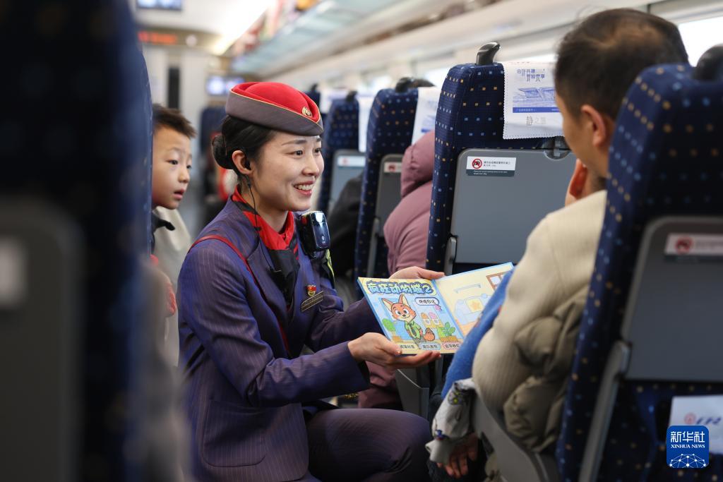 2月18日,在西安北開往武威東D2719次高鐵列車的靜音車廂,列車長(zhǎng)用繪本貼圖冊(cè)引導(dǎo)小旅客安靜乘車。