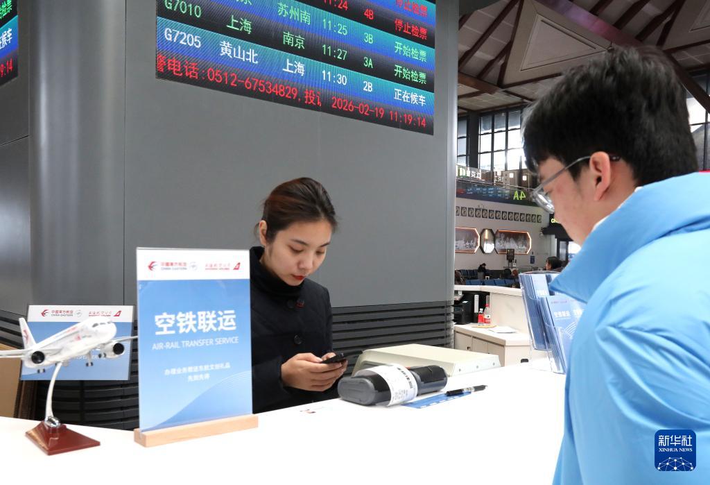 2月19日,在江蘇蘇州站候車大廳,旅客在東航“空鐵聯(lián)運(yùn)”服務(wù)柜臺(tái)辦理值機(jī)托運(yùn)。春運(yùn)期間,蘇州站啟用東航“空鐵聯(lián)運(yùn)”服務(wù)柜臺(tái),為搭乘高鐵前往上海虹橋、浦東兩大航空樞紐的中轉(zhuǎn)旅客提供一站式值機(jī)服務(wù)。