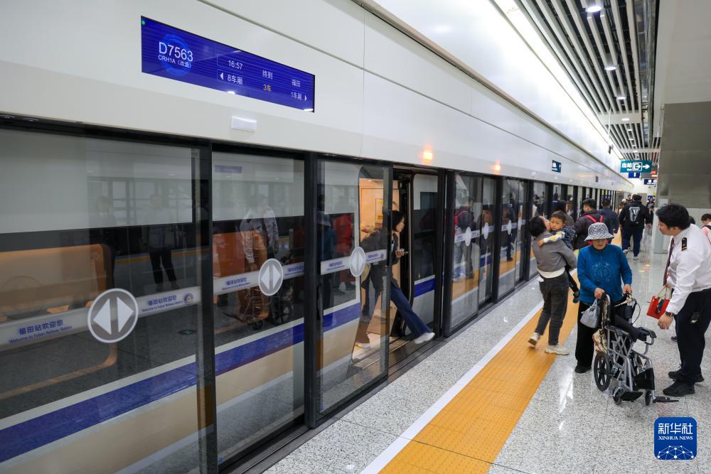 這是2月12日在深圳福田站拍攝的新屏蔽門。今年春運(yùn)前,福田站1至4站臺(tái)智能全滑動(dòng)式站臺(tái)屏蔽門系統(tǒng)投入使用。新的屏蔽門啟用后,福田站可以接入高鐵列車車型增多,旅客發(fā)送能力提升明顯。