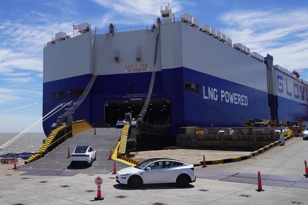 在上海自貿(mào)試驗(yàn)區(qū)臨港新片區(qū)南港碼頭,一批新能源汽車(chē)駛向一艘滾裝貨輪。新華社記者 楊有宗 攝