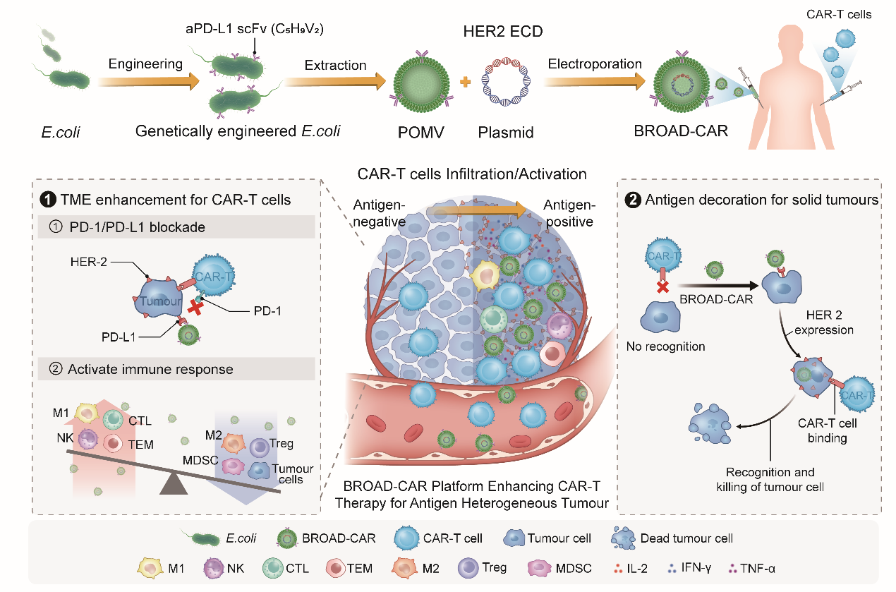在國家自然科學(xué)基金聯(lián)合基金、國家博士后創(chuàng)新人才計劃、中國博士后科學(xué)基金等項目的資助下,鄭桐森教授團隊把目光投向了“細菌外膜囊泡”——這是細菌自然產(chǎn)生的微小囊泡,自帶母體細菌的免疫激活特性。團隊通過基因工程改造,給這些囊泡賦予了兩大“超能力”,打造出了BROAD-CAR賦能平臺。