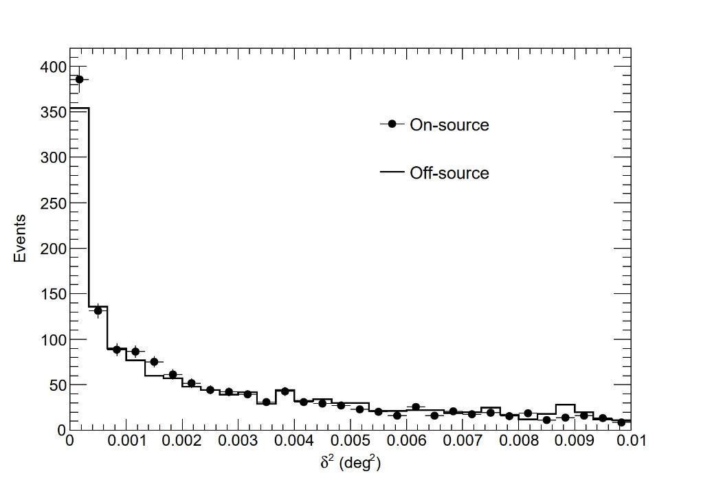 當(dāng)晚,這臺(tái)口徑6米的成像大氣切倫科夫望遠(yuǎn)鏡對(duì)準(zhǔn)蟹狀星云方向,捕捉宇宙線在大氣中引發(fā)的簇射粒子發(fā)出的切倫科夫光,給整個(gè)簇射拍攝完整圖像,在記錄到的成千上萬個(gè)宇宙線簇射事例中,成功捕獲到約6500年前發(fā)出的多個(gè)伽馬射線信號(hào)。