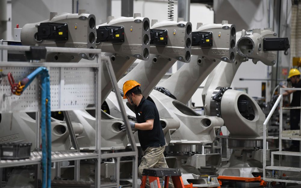 2025年3月25日在廣東佛山市美的庫(kù)卡智能制造科技園拍攝的工業(yè)機(jī)器人產(chǎn)線車間。新華社記者 鄧華 攝