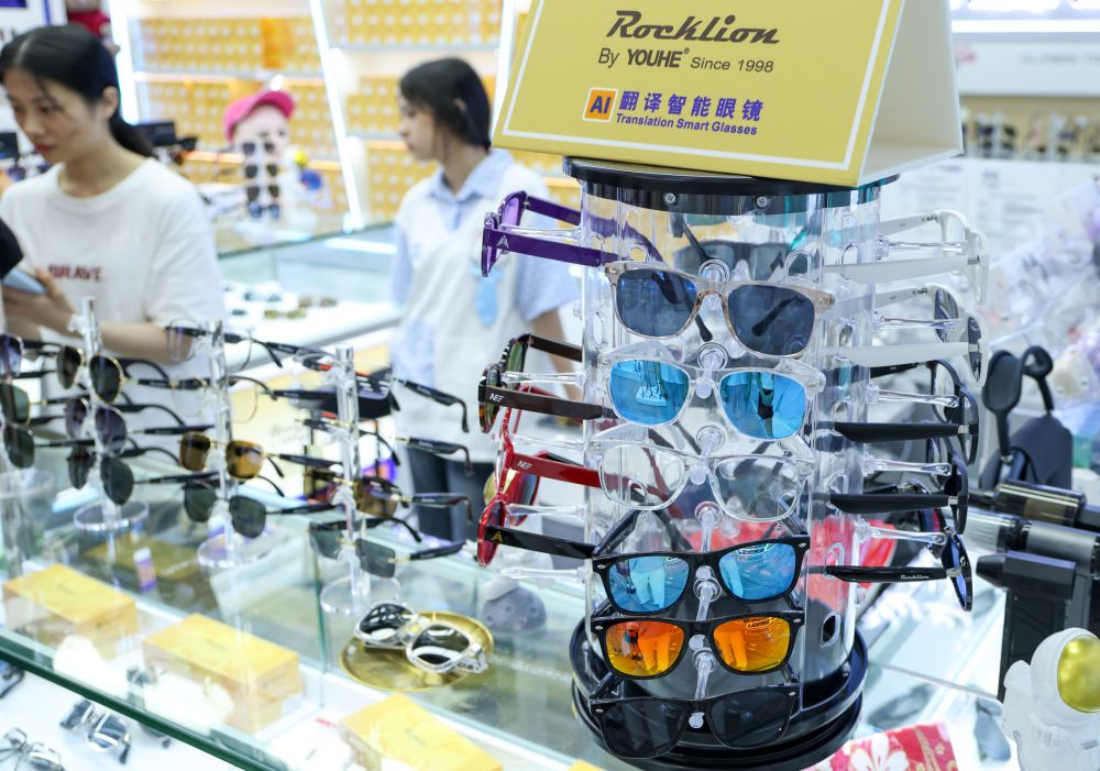 2025年7月22日,深圳華強(qiáng)北一家商戶的柜臺(tái)上擺放著不同款式的智能眼鏡。新華社記者 毛思倩 攝