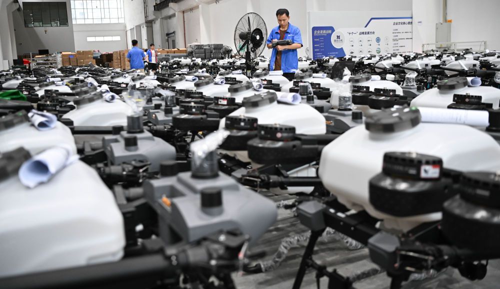 2025年6月26日,工作人員在聯(lián)合飛機(jī)集團(tuán)深圳基地植保無(wú)人機(jī)倉(cāng)庫(kù)內(nèi)巡視。新華社記者 鄧華 攝