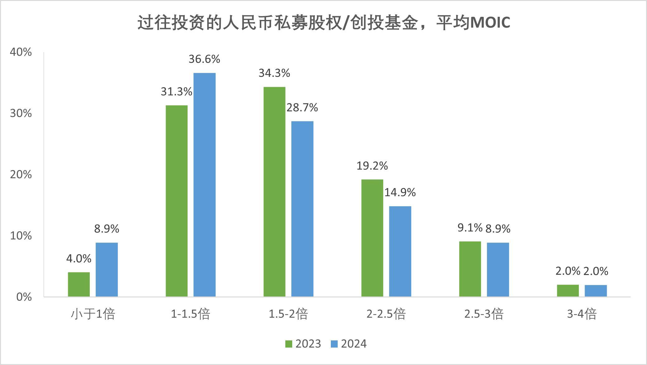 超六成(64.4%)機構(gòu)MOIC在1x-2x之間,僅2.0%達3x以上,多數(shù)投資尚未實現(xiàn)高倍數(shù)收益;45.5%預(yù)期MOIC降低。