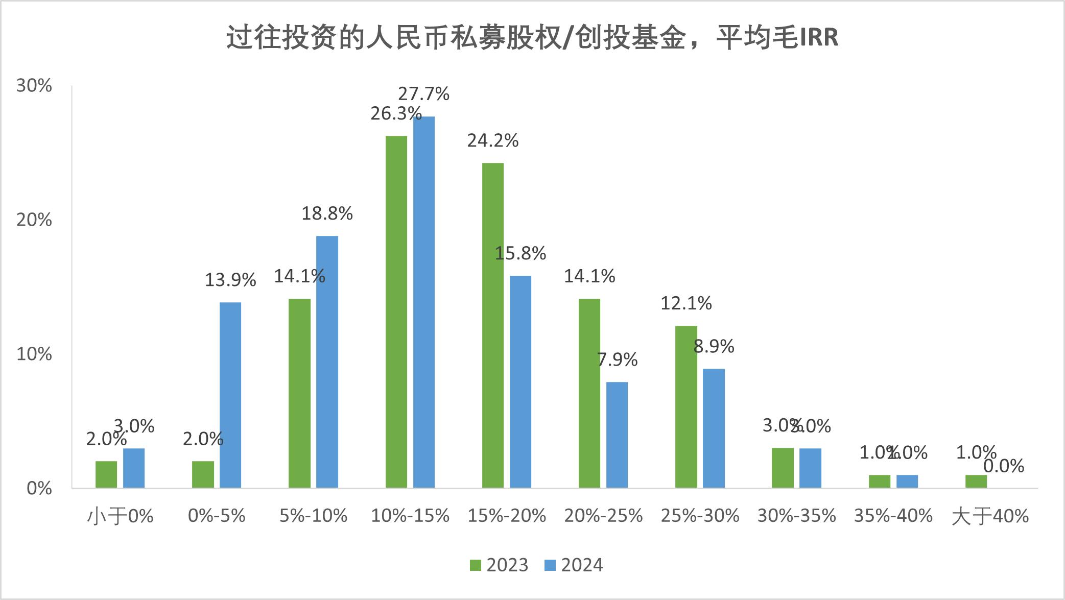 調(diào)研結(jié)果顯示,IRR主要集中在5%-20%區(qū)間(63.4%),仍有16.8%的機構(gòu)IRR低于5%,人民幣基金業(yè)績分化明顯;44.6%預(yù)測新基金IRR將下降。