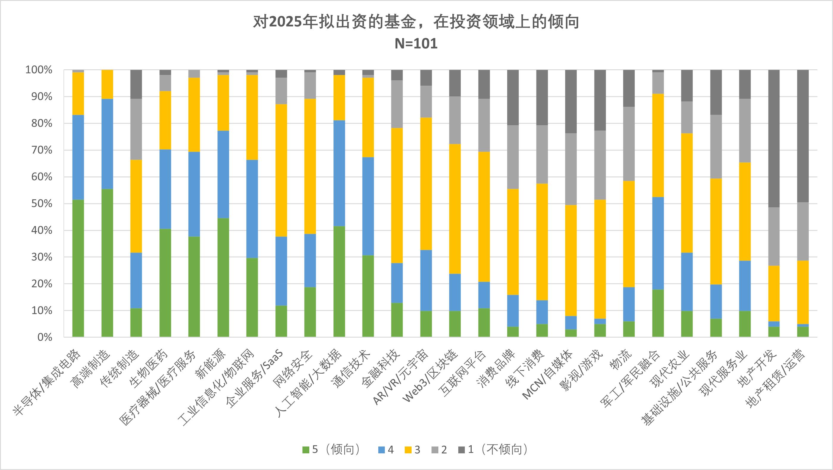 調(diào)研結(jié)果顯示,早期創(chuàng)投基金(天使/VC)、私募股權(quán)基金及政府引導(dǎo)基金最受青睞,市場化內(nèi)資機構(gòu)和本地國資背景GP更受信任,產(chǎn)業(yè)資本+政府資金的混合LP結(jié)構(gòu)更受偏好,這顯示出資源協(xié)同價值高于單純財務(wù)投資。半導(dǎo)體、高端制造、生物醫(yī)藥等“卡脖子”領(lǐng)域占據(jù)絕對主導(dǎo),而消費、文娛等周期敏感型行業(yè)被普遍回避,反映出LP對政策導(dǎo)向與產(chǎn)業(yè)鏈安全的強敏感性。