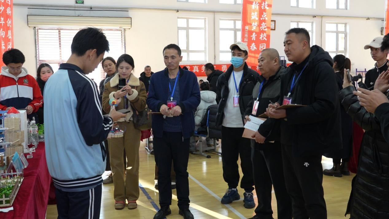 同江市第一小學(xué)體育館內(nèi)比賽氣氛熱烈,桌面上各種設(shè)計產(chǎn)品精細還原了三江口生態(tài)旅游區(qū)同三公路標(biāo)志塔、同江中俄鐵路大橋等同江元素,展現(xiàn)了學(xué)子們對家鄉(xiāng)建設(shè)的深切關(guān)注;充滿創(chuàng)意的“神舟二十一號”航天模型與空間站裝置,則承載著他們探索宇宙的遠大夢想。參賽學(xué)生化身為“小小發(fā)明家”,結(jié)合模型,向評委自信講解創(chuàng)作理念。評委團聆聽后,從多種維度進行現(xiàn)場打分,確保了賽事全程公平、公正與高效。
