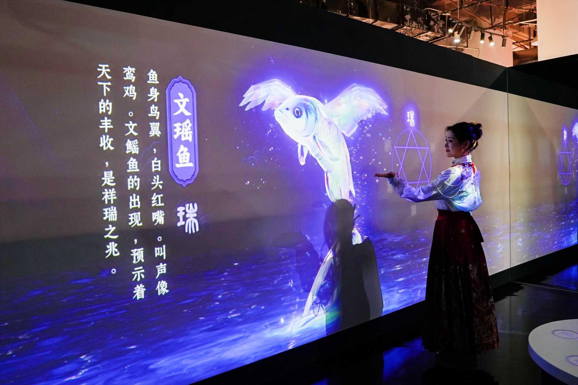 在神隱森林展區(qū)通過超大絕美造景,還原神靈異獸的隱匿世界,觀眾可體驗(yàn)漢服換裝,一秒穿越洪荒,與靈獸共舞。十余位知名AIGC數(shù)字藝術(shù)大咖以AI技術(shù)復(fù)活神獸,14米超長《山海百靈圖》山海經(jīng)畫卷首次亮相,呈現(xiàn)視覺震撼。