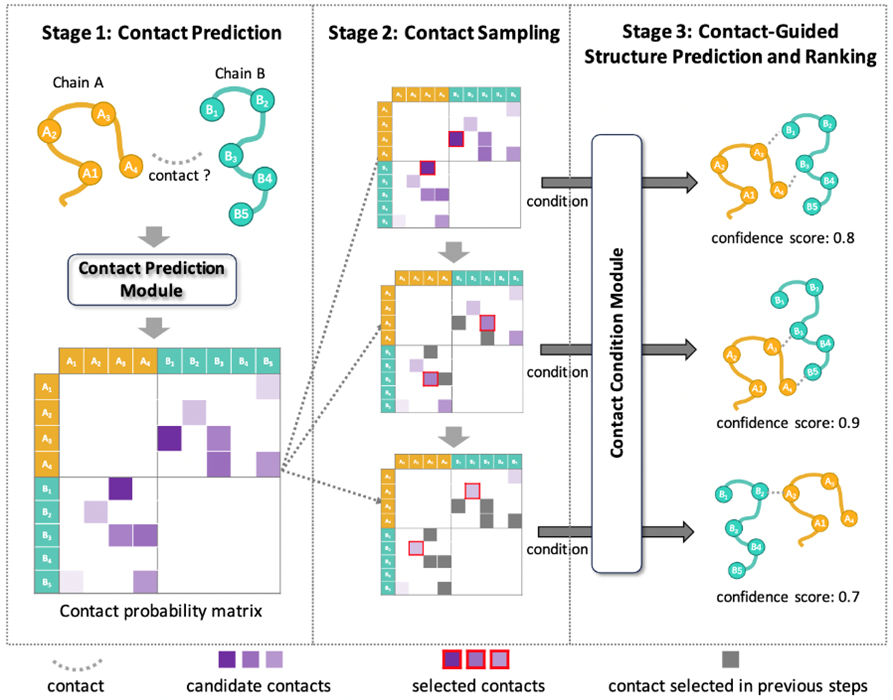 生命活動依賴于蛋白質(zhì)與化合物、RNA、抗原抗體等生物分子間的精準結(jié)合,解析分子間的三維結(jié)構(gòu)是藥物設(shè)計、疫苗研發(fā)等場景的核心。數(shù)年來,蛋白質(zhì)結(jié)構(gòu)預(yù)測始終是生命科學(xué)領(lǐng)域的重大機遇和挑戰(zhàn)。盡管國內(nèi)外已有多款生物分子結(jié)構(gòu)預(yù)測模型能夠較為準確地預(yù)測單個蛋白質(zhì)和復(fù)合體間的結(jié)構(gòu),但像AlphaFold3這類模型,大多依賴大規(guī)模盲采的傳統(tǒng)方法,即通過“廣撒網(wǎng)”生成海量結(jié)構(gòu),再從中篩選最優(yōu)解,面對缺乏共進化信息的新型分子或復(fù)合物的結(jié)合模式未見過的情況時,常因方向不明導(dǎo)致冗余采樣與預(yù)測失敗,預(yù)測效率低、精度不足。
