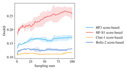 得益于接觸感知采樣策略,HelixFold-S1在性能上實現(xiàn)了突破性提升。在實際測試中,HelixFold-S1普遍比前代模型表現(xiàn)更好,在較難的抗原抗體場景上提升尤為明顯,實測數(shù)據(jù)顯示,對比base版本,HelixFold-S1在該場景下預(yù)測精度提升58%,對比Chai-1和Boltz-2分別提升80%和56%。同時,隨著取樣步數(shù)的增加,HelixFold-S1獲取更優(yōu)質(zhì)構(gòu)象的概率也在不斷增加,相比其他方法提升空間更顯著。