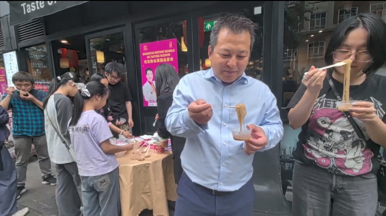 來自世界各地的消費(fèi)者排起長(zhǎng)隊(duì)爭(zhēng)相品嘗,嗦粉的“吸溜”聲此起彼伏。“Very good!”一位在英川渝同鄉(xiāng)邊吃邊贊嘆。更有消費(fèi)者舉著裝有光友粉絲的品嘗杯,在倫敦街頭邊走邊嗦,成了一道獨(dú)特的風(fēng)景線。