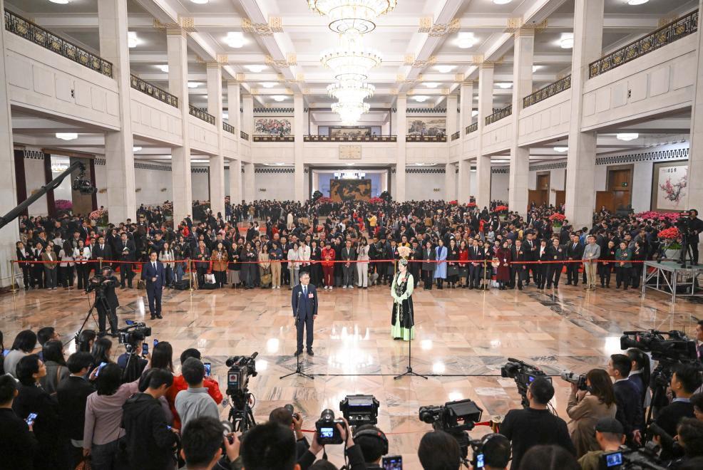閉幕會前,人民大會堂中央大廳北側(cè),第三場“代表通道”集體采訪活動正在進(jìn)行。