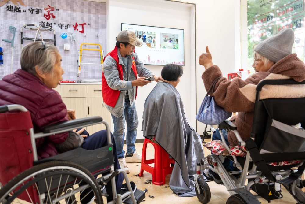 2025年11月6日,在湖南省長沙市望城區(qū)高塘嶺街道湘陵社區(qū),志愿者為老年人和殘疾人士免費理發(fā)。新華社記者 陳思汗 攝