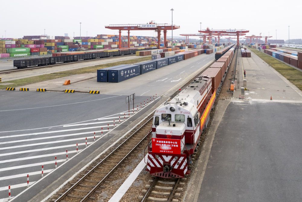 2025年12月5日拍攝的上海鐵路蘆潮港集裝箱中心站(無(wú)人機(jī)照片)。當(dāng)日上午,一趟載有太陽(yáng)能光伏組件、汽車(chē)零配件等貨物的海鐵聯(lián)運(yùn)班列緩緩從上海蘆潮港集裝箱中心站開(kāi)出,上海海鐵聯(lián)運(yùn)年度業(yè)務(wù)量首次跨越百萬(wàn)標(biāo)箱大關(guān)。新華社記者 王翔 攝