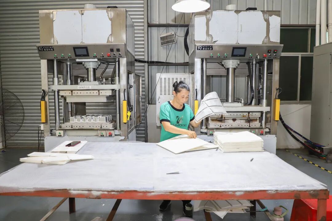 企業(yè)車(chē)間內(nèi),清遠(yuǎn)麻竹、甘蔗、秸稈、菌草、咖啡渣等農(nóng)林廢棄物,經(jīng)過(guò)制漿調(diào)漿、壓制成型、整形切邊等工序,“變身”為牢固耐用、防水防油的環(huán)保產(chǎn)品。