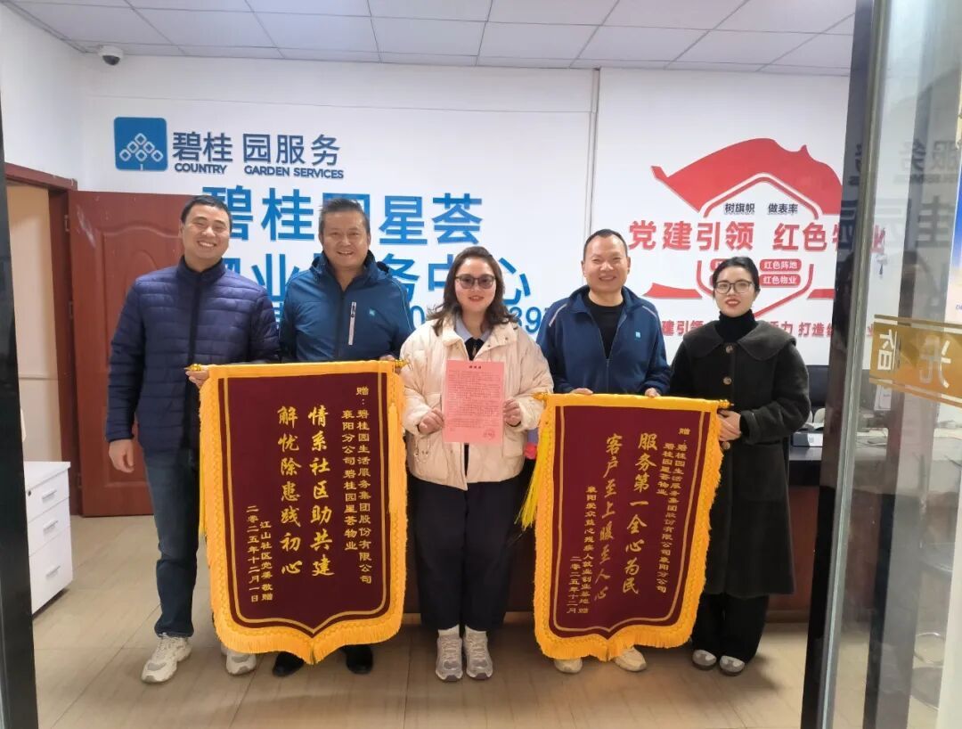 12月1日上午,江山社區(qū)黨委書(shū)記侯婷婷與襄陽(yáng)愛(ài)眾益心殘疾人就業(yè)創(chuàng)業(yè)基地負(fù)責(zé)人陳程,一同將兩面鐫刻著“情系社區(qū)助共建 解憂除患踐初心”“服務(wù)第一全心為民 客戶至上暖至人心”的錦旗及感謝信,送到碧桂園星薈物業(yè)經(jīng)理朱文文手中。