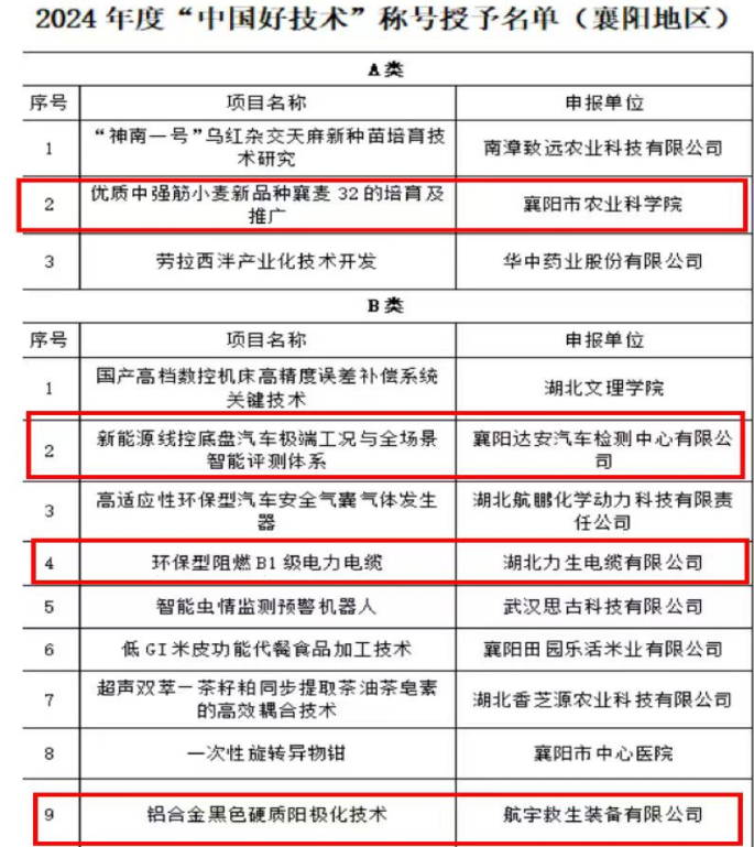 此次獲評的四項(xiàng)技術(shù),均來自襄陽高新區(qū)主導(dǎo)產(chǎn)業(yè)細(xì)分領(lǐng)域關(guān)鍵技術(shù)突破:襄陽市農(nóng)業(yè)科學(xué)院的優(yōu)質(zhì)中強(qiáng)筋小麥新品種襄麥32的培育及推廣技術(shù)破解優(yōu)質(zhì)高產(chǎn)兼顧難題,為糧食安全提供“襄陽方案”;襄陽達(dá)安汽車檢測中心有限公司新能源線控底盤汽車極端工況與全場景智能評測體系實(shí)現(xiàn)極端工況全場景評測,助力汽車產(chǎn)業(yè)高端化智能化轉(zhuǎn)型;湖北力生電纜有限公司研發(fā)環(huán)保型阻燃B1級電力電纜,以綠色創(chuàng)新賦能基礎(chǔ)設(shè)施升級;航宇救生裝備有限公司鋁合金黑色硬質(zhì)陽極化技術(shù)為航空航天裝備提供高品質(zhì)表面處理方案,鞏固高端制造優(yōu)勢。