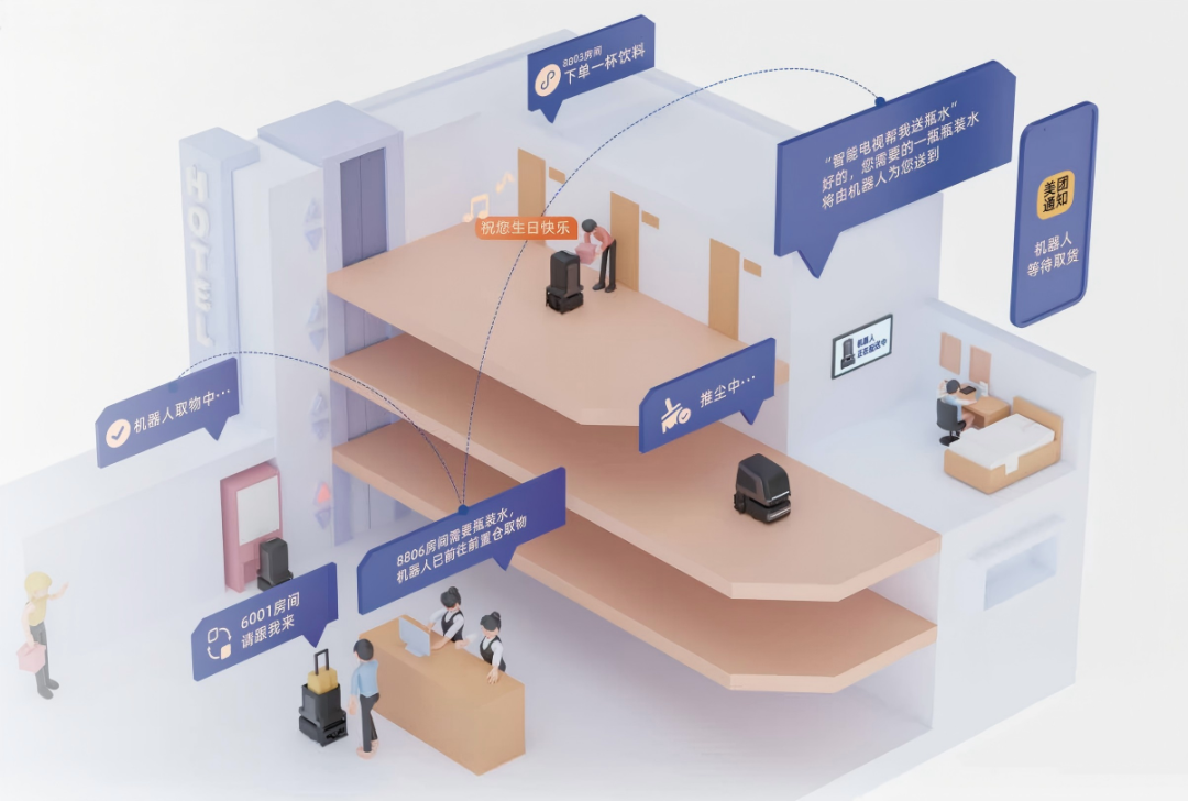 云跡科技自研的AI智能體應用系統(tǒng)HDOS,作為“智慧大腦”可自動分配任務、串聯(lián)各服務環(huán)節(jié),達到機器人主動理解場景、靈活協(xié)作的效果。例如,當酒店接入HDOS系統(tǒng)后,酒店房間設(shè)置的飲料柜不再需要員工挨個查看,而是實時看到貨品余量,客人只需在房間掃碼下單,機器人就可自主送貨。