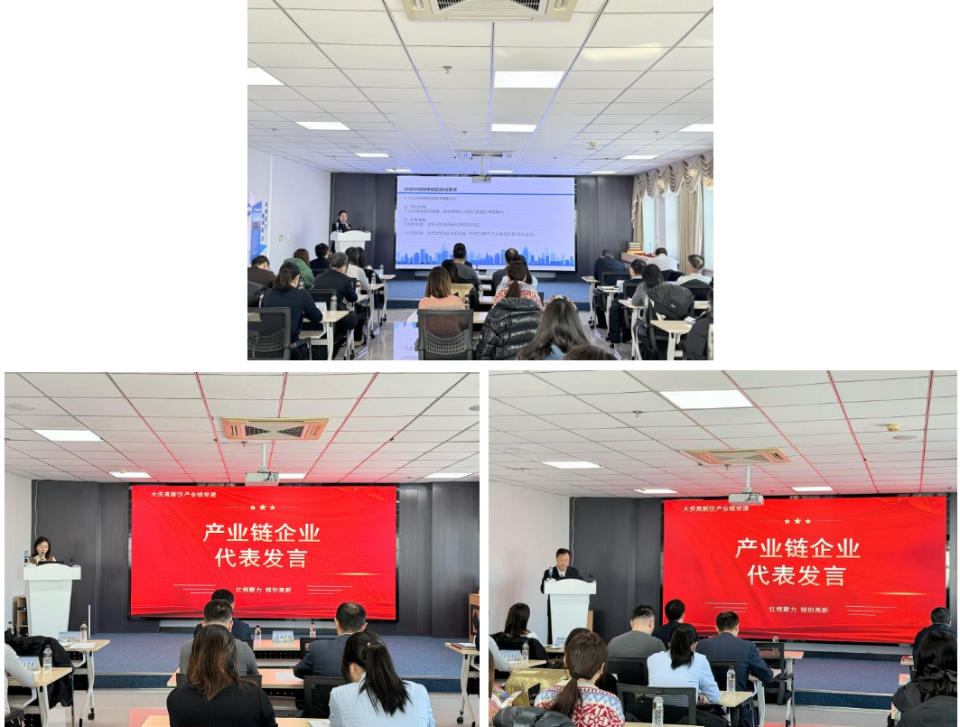 會上,5個產(chǎn)業(yè)黨委按照“圍繞產(chǎn)業(yè)抓黨建 抓好黨建興產(chǎn)業(yè)”的工作思路,結合織密鏈上組織體系、健全鏈上服務機制、豐富鏈上活動載體等重點工作,匯報了2025年度產(chǎn)業(yè)鏈黨建工作成效。大慶高新區(qū)營商環(huán)境建設監(jiān)督局、大慶高新區(qū)市場監(jiān)督管理局、大慶高新區(qū)稅務局等新興領域黨建聯(lián)席會議成員單位代表,分別分享了構建“產(chǎn)業(yè)鏈一件事”協(xié)同服務體系、打造知識產(chǎn)權試點園區(qū)賦能平臺、落實稅收申報政策等靶向助企經(jīng)驗。大慶明陽智慧能源有限公司、大慶金祥寓科技有限公司作為“鏈長企業(yè)”代表,分享了依托產(chǎn)業(yè)黨委搭建黨建聯(lián)建平臺、鏈接上下游資源、破解發(fā)展難題的實踐做法。大慶高新區(qū)工委組織部為2025年產(chǎn)業(yè)鏈黨建工作“優(yōu)秀企業(yè)”和“突出貢獻”職能部門黨組織頒發(fā)榮譽證書,鼓勵產(chǎn)業(yè)鏈上下游企業(yè)和職能部門見賢思齊,提升抓好黨建、服務發(fā)展的積極性和責任感,切實凝聚起黨建助推產(chǎn)業(yè)發(fā)展的強大合力。