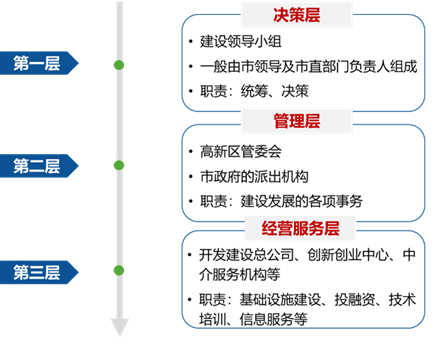 1988年,國務(wù)院批準實施火炬計劃,明確把創(chuàng)辦高新區(qū)作為火炬計劃的重要內(nèi)容;同年,批準建立第一個國家高新區(qū)——北京市新技術(shù)產(chǎn)業(yè)開發(fā)試驗區(qū)(以下簡稱“北京試驗區(qū)”),也就是中關(guān)村科技園區(qū)的前身,批準頒布《北京市新技術(shù)產(chǎn)業(yè)開發(fā)試驗區(qū)暫行條例》,拉開了我國建設(shè)國家高新區(qū)的序幕。北京市政府根據(jù)該《暫行條例》發(fā)布實施細則,明確規(guī)定北京市試驗區(qū)辦公室是海淀區(qū)人民政府的派出機構(gòu) ,在海淀區(qū)人民政府領(lǐng)導(dǎo)和市科委指導(dǎo)監(jiān)督下,具體辦理新技術(shù)企業(yè)的審批核定事宜。同年7月,為加強對北京試驗區(qū)的領(lǐng)導(dǎo)和協(xié)調(diào)工作,北京市政府牽頭組建了北京試驗區(qū)協(xié)調(diào)委員會 ,由北京市副市長任委員會主任,北京試驗區(qū)辦公室兼協(xié)調(diào)委員會辦公室職能。北京試驗區(qū)的建設(shè)模式為后來國家高新區(qū)組建領(lǐng)導(dǎo)小組,成立作為政府派出機構(gòu)的管委會奠定了重要基礎(chǔ)。在中關(guān)村科技園區(qū)成功探索的基礎(chǔ)上,1991年和1992年,國務(wù)院先后批準建立了51家國家高新區(qū),全面啟動國家高新區(qū)建設(shè)。為貫徹落實黨中央、國務(wù)院的指示精神,1991年,原國家科委和國家體改委研究制定了《關(guān)于深化高新技術(shù)產(chǎn)業(yè)開發(fā)區(qū)改革,推進高新技術(shù)產(chǎn)業(yè)發(fā)展的決定》,進一步明確了國家高新區(qū)改革的基本方向、原則和思路,明確國家高新區(qū)要根據(jù)發(fā)展社會主義有計劃商品經(jīng)濟的要求,建立起符合商品經(jīng)濟運行規(guī)律,適應(yīng)高新技術(shù)產(chǎn)業(yè)發(fā)展要求和國際慣例的體制、機制;各開發(fā)區(qū)要因地制宜地建立決策、管理機構(gòu),賦予相應(yīng)的權(quán)限,代表當(dāng)?shù)卣惺剐姓殭?quán), 統(tǒng)一對內(nèi)對外,集中有效地協(xié)調(diào)解決開發(fā)區(qū)發(fā)展中的重大問題,并在工商、稅務(wù)、財政、金融、國際合作交流、外貿(mào)、進出口等方面形成配套、高效的服務(wù)功能,為企業(yè)提供綜合服務(wù)。在1988年到2000年的“一次創(chuàng)業(yè)”階段,國家高新區(qū)發(fā)展到53家,成為我國高新技術(shù)的集聚地和成果轉(zhuǎn)化、產(chǎn)業(yè)發(fā)展的增長極。由于這一階段高新技術(shù)產(chǎn)業(yè)發(fā)展基礎(chǔ)總體薄弱,需要強有力的管理機構(gòu)創(chuàng)造發(fā)展環(huán)境,同時借鑒了當(dāng)時國家經(jīng)開區(qū)的管理經(jīng)驗,大多高新區(qū)采取較封閉的管理模式,探索集中授權(quán)管理。 初步形成了具有中國特色的“領(lǐng)導(dǎo)小組+管委會+公司” 管理架構(gòu),實行“決策層-管理層-服務(wù)層” 開放式管理模式。其中,“決策層”即由市政府主要負責(zé)人及市政府有關(guān)行政管理部門負責(zé)人組成的領(lǐng)導(dǎo)小組,為強化政府的作用,一般由市級主要領(lǐng)導(dǎo)擔(dān)任領(lǐng)導(dǎo)小組組長。主要負責(zé)宏觀決策、重大政策制定、用地規(guī)劃、協(xié)調(diào)解決高新區(qū)開發(fā)建設(shè)及管理過程中的重大問題等?!肮芾韺印奔醋鳛檎沙鰴C構(gòu)的管委會,代表當(dāng)?shù)卣惺拐殭?quán),對園區(qū)實行統(tǒng)一領(lǐng)導(dǎo),負責(zé)具體發(fā)展規(guī)劃、建設(shè)和管理等職責(zé)?!胺?wù)層”即設(shè)立園區(qū)開發(fā)建設(shè)公司、創(chuàng)新創(chuàng)業(yè)中心等,負責(zé)園區(qū)基礎(chǔ)設(shè)施建設(shè)、投融資、創(chuàng)業(yè)孵化等功能。實踐中,各國家高新區(qū)也結(jié)合自身實際情況,逐步探索適宜區(qū)域特征、順應(yīng)市場經(jīng)濟發(fā)展的多樣化管理體制 。如南京高新區(qū)創(chuàng)建初期采取以管委會為主導(dǎo)的政企并存模式;海南高新區(qū)、深圳高新區(qū)采取以企業(yè)、總公司為主導(dǎo)的管理體制;桂林高新區(qū)由具有一定行政職能的事業(yè)單位來實行企業(yè)管理;中山、廈門和威海三個國家高新區(qū),由原國家科委、省科委和當(dāng)?shù)卣限k,被命名為火炬高新區(qū),在行政管理的基礎(chǔ)上,成立開發(fā)總公司,負責(zé)高新區(qū)基礎(chǔ)設(shè)施建設(shè)、新技術(shù)產(chǎn)業(yè)投資和部分公共事務(wù)管理。