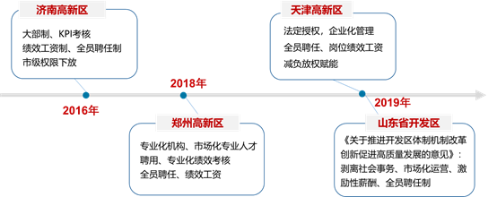 三、“創(chuàng)新驅(qū)動戰(zhàn)略提升”階段: 加快轉(zhuǎn)變政府職能,著力推進市場化改革 黨的十八大以來,改革進入了深水區(qū),開放邁向了新階段,創(chuàng)新驅(qū)動發(fā)展成為國家戰(zhàn)略,國家高新區(qū)進入“創(chuàng)新驅(qū)動、戰(zhàn)略提升”階段 。黨中央、國務(wù)院高度重視轉(zhuǎn)變政府職能,把“放管服”改革作為全面深化改革的重要內(nèi)容,持續(xù)推進簡政放權(quán),實行放管結(jié)合,優(yōu)化行政服務(wù),以市場在資源配置中起決定性作用和更好發(fā)揮政府作用為目標,著力破解制約科技創(chuàng)新活力的體制機制障礙。2013年,科技部出臺《國家高新區(qū)戰(zhàn)略提升行動方案》,提出國家高新區(qū)要積極建設(shè)服務(wù)型政府,形成國家、地方、社會等各方力量聯(lián)合治理新模式。2017年2月,國務(wù)院辦公廳出臺《關(guān)于促進開發(fā)區(qū)改革和創(chuàng)新發(fā)展的若干意見》(國辦發(fā)[2017]7號),提出開發(fā)區(qū)要將政企分開、政資分開,行政剝離、市場化運作作為下一步改革的重點方向。2020年7月,國務(wù)院出臺《關(guān)于促進國家高新技術(shù)產(chǎn)業(yè)開發(fā)區(qū)高質(zhì)量發(fā)展的若干意見》(國發(fā)〔2020〕7號),對國家高新區(qū)深化管理體制機制改革作出頂層設(shè)計 ,要求國家高新優(yōu)化內(nèi)部管理架構(gòu),實行扁平化管理,探索崗位管理制度,實行聘用制,建立完善符合實際的分配激勵和考核機制,并賦予國家高新區(qū)相應(yīng)的省級和市級經(jīng)濟管理權(quán)限。綜合來看,我國正處于轉(zhuǎn)變發(fā)展方式、優(yōu)化經(jīng)濟結(jié)構(gòu)、轉(zhuǎn)換增長動力的攻關(guān)期,國家高新區(qū)過去依賴政策紅利、政府主導(dǎo)色彩濃厚等長期積累的問題逐漸顯露,面臨著要素成本制約、政策優(yōu)勢減弱、區(qū)域內(nèi)外競爭壓力增大、發(fā)展活力不足、發(fā)展動能減弱等困境,因此積極轉(zhuǎn)變政府職能、引入市場化效率機制勢在必行。圍繞“放管服”深化改革,一批國家高新區(qū)開始積極探索符合新時代要求的行政審批、組織機構(gòu)、人事管理、薪酬激勵新機制,著力構(gòu)建精簡高效的管理服務(wù)體系 。如2016年濟南高新區(qū)堅持問題導(dǎo)向,圍繞“企業(yè)化管理、市場化運作、專業(yè)化服務(wù)”目標,推行機構(gòu)大部制、實行全員聘任制、改革干部考評體系、采用績效工資制、深化簡政放權(quán),激發(fā)高新區(qū)發(fā)展創(chuàng)造力。2019年天津濱海高新區(qū)依據(jù)自身為功能區(qū)的本質(zhì),推行法定機構(gòu)改革,目標是去除行政事業(yè)身份,全面引入市場化經(jīng)營理念和企業(yè)化激勵機制。2020年,玉溪高新區(qū)、蘭州高新區(qū)等圍繞強化經(jīng)濟發(fā)展和創(chuàng)新促進功能,探索開展全員聘任制、績效考核制、薪酬激勵制等改革,以進一步激發(fā)廣大干部的干事創(chuàng)業(yè)熱情。
