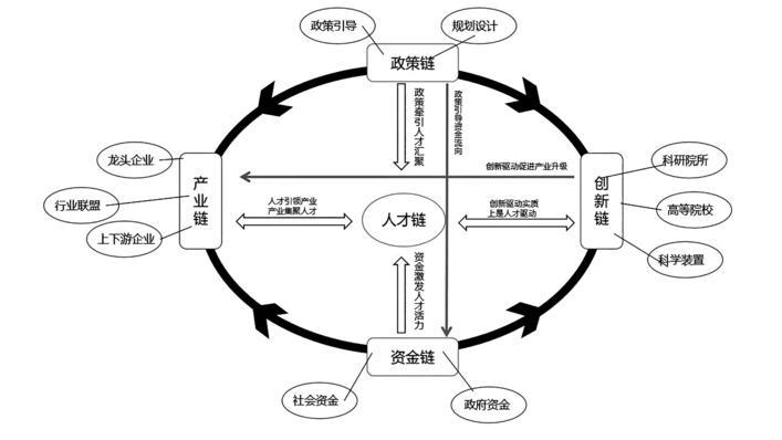 “五鏈”融合系統(tǒng)的建設(shè)與穩(wěn)定,需要有基于全局的統(tǒng)籌和保障。政策鏈?zhǔn)恰拔彐湣比诤现凶钪匾臓恳齽?dòng)力,通過作用于產(chǎn)業(yè)鏈、人才鏈、創(chuàng)新鏈和資金鏈,營造共同發(fā)力的環(huán)境,環(huán)環(huán)契合形成“1+1+1+1+1>5”的效果,為“五鏈”融合構(gòu)建人才引領(lǐng)發(fā)展保駕護(hù)航。“五鏈”融合過程涉及諸多要素,人才具有流動(dòng)性、資本具有逐利性、創(chuàng)新具有目的性、產(chǎn)業(yè)鏈分布具有層次性和指向性,需要政府立足更高站位,在構(gòu)建外部發(fā)展環(huán)境的同時(shí),在“五鏈”內(nèi)部發(fā)力,以更強(qiáng)的使命擔(dān)當(dāng)引領(lǐng)“五鏈”融合,通過一系列政策對(duì)人才、產(chǎn)業(yè)、創(chuàng)新和資金賦能,打造政策鏈的生態(tài)閉環(huán),最終形成政策的牽引合力。