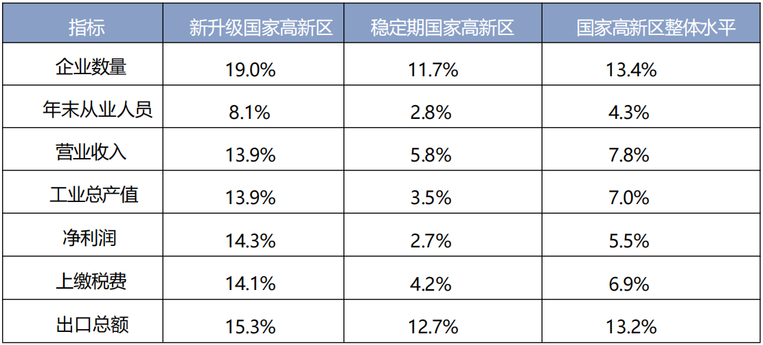 與穩(wěn)定期國家高新區(qū)相比,新升級國家高新區(qū)由于產業(yè)規(guī)模較小、經濟基礎相對較弱,因此主要經濟指標增速相對較快,增速高于穩(wěn)定期國家高新區(qū)和國家高新區(qū)整體增速。其中,從業(yè)人員數量、營業(yè)收入、工業(yè)總產值、凈利潤上繳稅收等增速,是穩(wěn)定期國家高新區(qū)和國家高新區(qū)整體增速的兩倍以上。